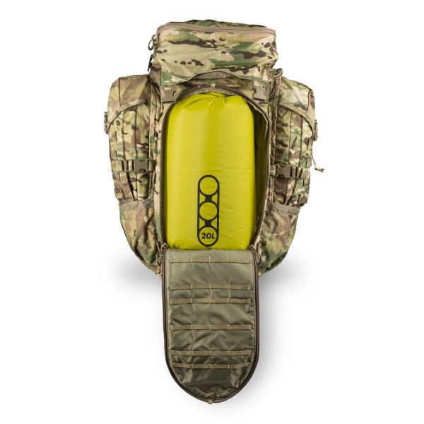 Although stripped down, the Tomahawk is still feature rich. A floating lid doubles as a removable fanny pack go-bag. Bottle holders, full length side pockets, and quick-stow sleeves are on each side. The main compartment is accessed through either a storm-collar top or the quick-pull spade front door. The interior features a Nylex back wall (15"x11"), tuck pockets, and EMOD Hookup links.